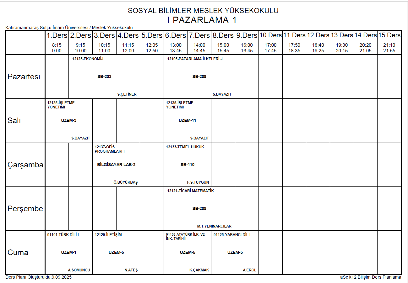 2025-2026 GÜZ DÖNEMİ PAZARLAMA-I DERS PROGRAMI